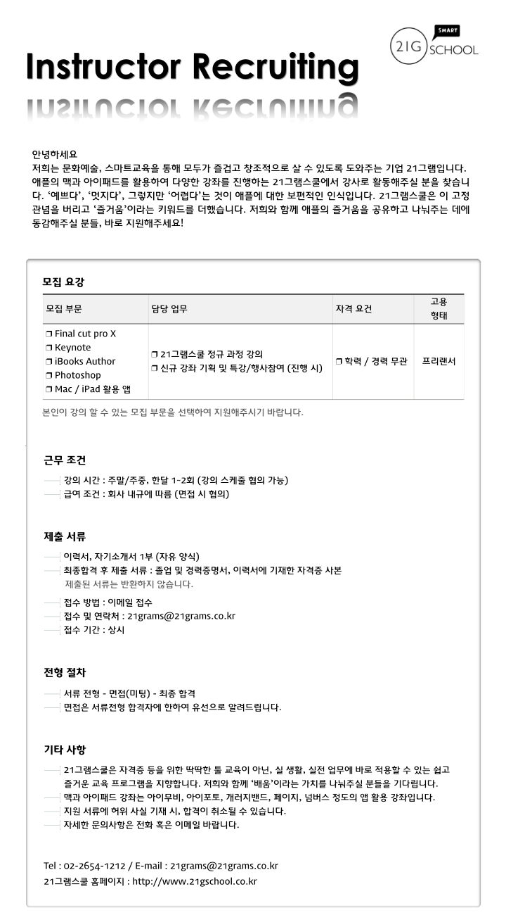 21그램스쿨 강좌 리뉴얼로 인해 스쿨에서 강좌를 맡아서 진행해주실 다양한 분야의 강사님을 모집하고 있습니다.