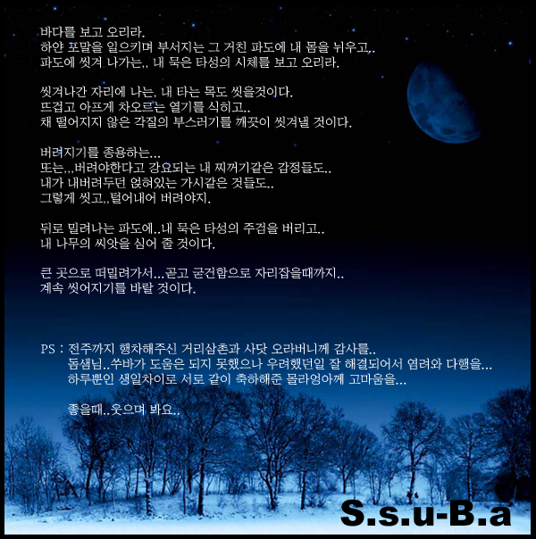 바다를 본다고 달라지는게 있을까나..? 물론 그때만큼은 숨통도 트이는 것 같고. 각오도 새로워지겠지만.. 아마 그건 잠시 뿐일꺼야... 바다를 보지 않고도 본 것같은 감정을 갖도록 노력혀... =_=