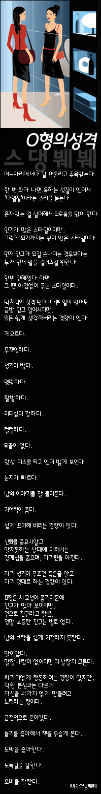 주위에서 말하는 내성격 그대로다;;; 쑤바님 다른 혈액형도 올려주세요~ 잼있네요^^