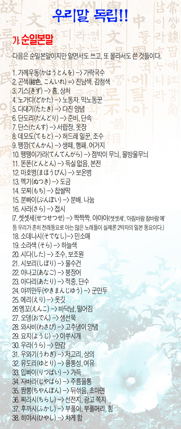 본식 외래말을 정리하여 더욱 우리말글을 건강하고, 위대하도록 가꾸어