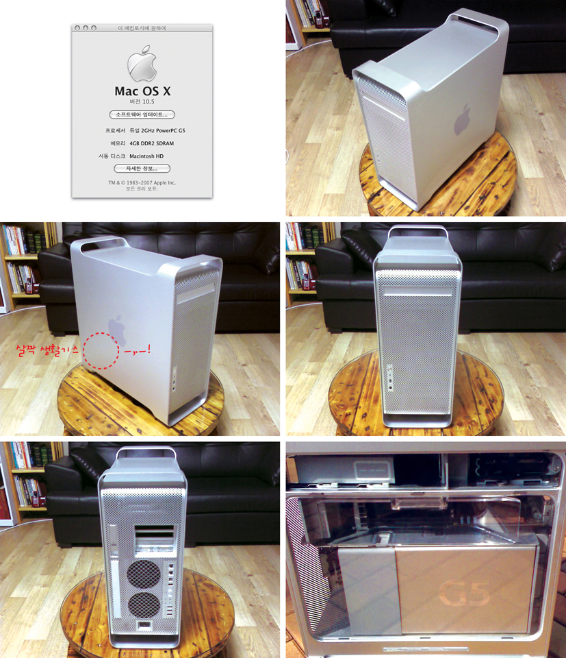 듀얼 2.0GHz PowerPC G5 / 메모리 4GB / 하드 400GB (2009년 12월말 디자인회사에서 구매) 구매 당시 Mac OS X 10.5 시스템이며 현재는 Photoshop, Illustrator, Indesign CS3 내장. 구기종(G4) 대체용으로 구매했다가 거의 사용을 하지않아 본체만 판매하려함. 좌측면 생활기스 살짝. 강동구 거주하시는 분 현금 직거래 환영. 방문하셔서 시간구애 받지마시고 꼼꼼히 체크하시고 결정바람. (전화 문의 : 09:00-24:00)