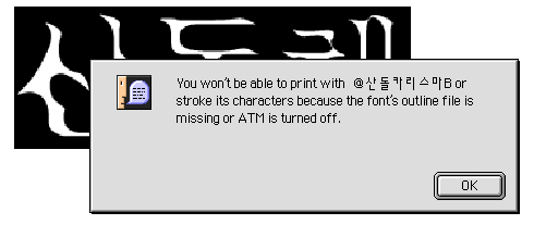 위 메세지는 ATM에 문제가 있어서 나오는 메세지가 아닙니다. 자형폴더에 들어있는 산돌서체가 화면용 서체이기 때문에 아웃라인이 안됩니다라는 문구 입니다. 일러스트에서 아웃라인은 트루타입 서체만 가능합니다. 트루타입서체는 용량이 1MB 이상이고요. 화면용 서체는 1MB 이하 입니다. 다시 말해서 자형폴더에 트루타입서체를 넣고 사용해야 해결이 되는 내용 입니다. 화면용 서체는 무로서체이고 용량이 작아서 화면에서 비트맵처럼 보입니다. 화면에서 제대로 보이고 아웃라인이 되는 서체는 트루타입서체고요. 상용(판매용)서체 입니다. =================== 도움이 필요하시면 베스트맥(A/S,판매)를 클릭하고 자기소개를 참고하세요
