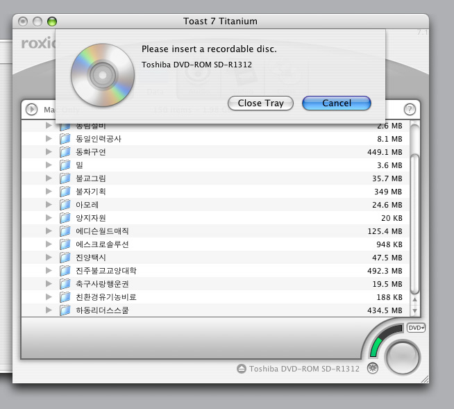 맥기종이 어떻게 되시나요. 현재 시디룸이 DVD를 읽을수만 있는 콤보인것 같습니다. 콤보에서는 DVD-RW가 안됩니다. 단지 DVD시디를 넣고 볼수만 있습니다. 다시 말해서 시디룸이 DVD-RW가 아니면 DVD굽기가 안됩니다. =================== 도움이 필요하시면 베스트맥(A/S,판매)를 클릭하고 자기소개를 참고하세요