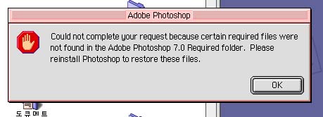 일단 포토샵7실행시 위와 같은 메세지가 나오는 이유는 하드디스크에 이름이 한글로 되어 있기 때문입니다. 한글로 되어 있으면 포토샵7과 일러스트10이 실행 안됩니다. 조절판에 파일공유에서 공유를 꺼야 이름변경이 가능합니다. 영어나 숫자로 하셔야 됩니다. 다른 맥에 포토샵이나 일러스트를 복사해서 사용하시거나 한글시스템을 새로 인스톨 하시면 아래에 내용이 한글시스템안에 없어서 포토샵에서 한글이 안쳐지고 EPS 깨집니다. (일부 서체만 깨질수도 있습니다.) http://kmug.co.kr/board/zboard.php?id=system&no=456&ln=&ls=on&lc=on&lcc=&keyword=%252525C0%252525C0%252525BF%252525EB%252525C7%252525C1%252525B7%252525CE%252525B1%252525D7%252525B7%252525A5 포토샵 인스톨 프로그램을 실행해서 사용자설치에 보시면 Type support(cmap files / fonts)라는 항목을 체크하고 인스톨 하세요.(기본설치에서는 인스톨이 안되고 빠집니다.) cmaps-포토샵에서 한글 타이핑 지원 fonts-eps시 서체가 안깨지거나 에러가 안나게 함 위 내용은 한글시스템안에 응용프로그램지원안에 복사가 됩니다. 포토샵이나 일러스트는 반드시 인스톨를 권장합니다.(포토샵은 사용자설치에서 모두 체크하시고요.) 물론 잘되는 다른 맥이 있다면 한글 시스템안에 응용프로그램지원안에 adobe폴더를 복사해 오셔도 됩니다 =================== 도움이 필요하시면 베스트맥(A/S,판매)를 클릭하고 자기소개를 참고하세요