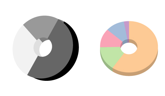 일러의 그래픽기능을 이용하시는 것인데.. 수치가 자주 바뀌는것이 아니라면 직접 새로 그리시는것이 좋아요. 아니라면 도표를 선택하고 옵션키누르며 클릭하면 수치입력하는 'data'항목을 선택하고 비율대로 수치를 넣어보세요.. 원은 비례이니까 비례에 맞춰 숫자를 정해줘야 하겠죠.. 그다음엔 다이랙트셀렉트(하얀화살)아이콘을 선택한 뒤에 하나하나 색을 입히시는 겁니다. ..... 그래픽툴로 만든건 패스+툴로 하려면 안될겁니다.