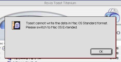 토스트에서 레코딩시에 지금 Mac OS and PC(Hybrid) CD로 포맷이 맞춰져 있어 이런 현상이 생기는 것이니, 맨 처음 나온 메시지의 내용대로 Mac OS Extended and PC(Hybrid) CD로 포맷을 바꿔주세요.