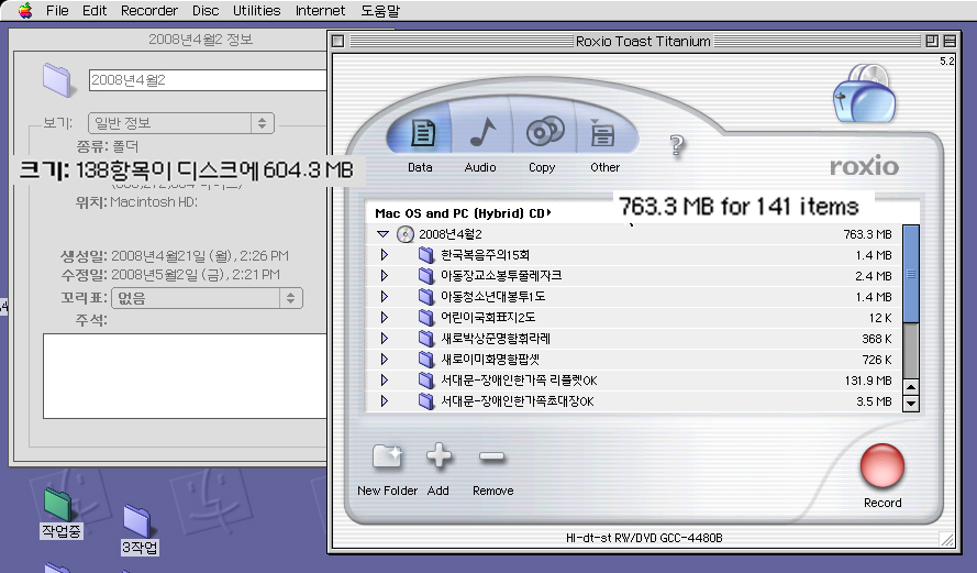 하드디스크 포맷이 Extended 포맷으로 되어 있는데 토스트의 포맷은 Mac OS  and PC(Hybrid) CD로 맞춰져 있으면 용량이 늘어나게 되며, 토스트의 포맷을 하드디스크의 포맷과 똑같이 Extended 포맷으로 맞춰주면 용량이 늘어나는 문제가 사라지게 됩니다.
