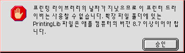 혹 LaserWriter를 바꾸셨나요? 버전이 안맞아서 그런것 같습니다. 어도비 사이트 에서 새로운 프린터드라이버를 받으시던가, 이곳 자료실에 있는지 모르겠네요 암튼 프린터드라이버(LaserWriter)를 새로 설치하셔야 할것 같습니다.