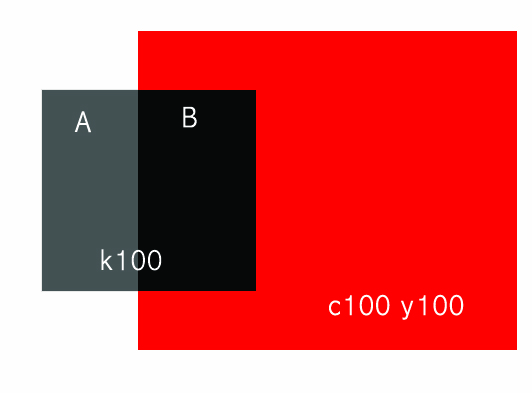 보기 그림처럼 C100 Y100 의 사각형 위에 검은 사각형 K100 을 올려서 필름출력했을 때