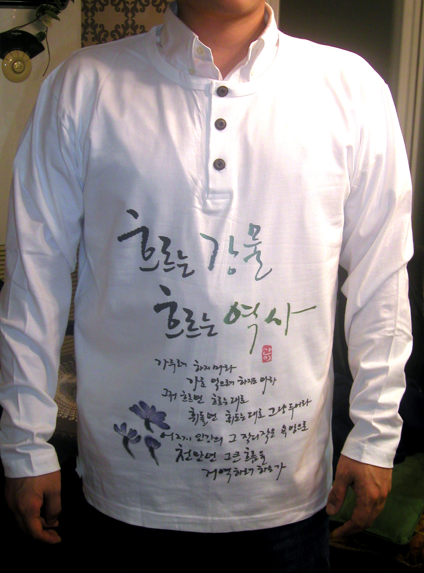 "산이" 란 분의 "캘리그라피" 를 적용하여 만든 티셔츠입니다.