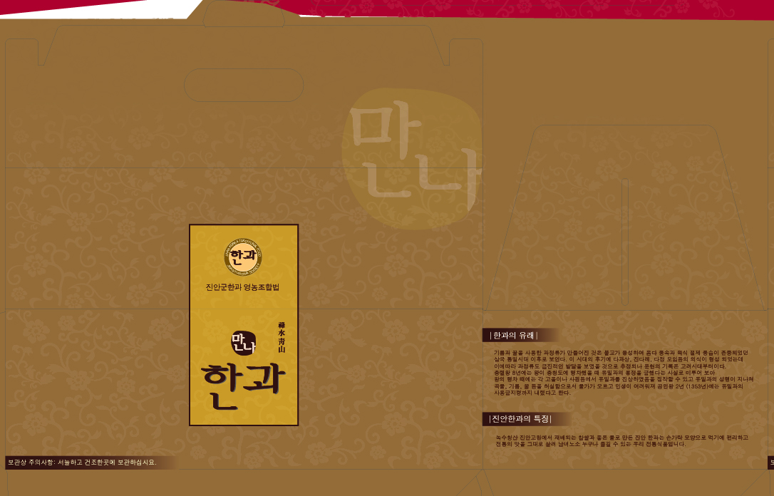 이건 머..썰렁하네요. 한과나 머 다른 이미지가 하나도 없고... 이미지가 없으면.. 좀더 디테일한게 있어야할텐데.. 딸랑 배경에 흔한 문양만 깔려있고.. 컬러는 어둡고... 서체는 평범하고...-_-;; 전 패키지 작업은 안하지만... 다른 패키지들을 많이 봐와서 그런지... 솔직히..무성의하다고 밖에 할말이 없네요..
