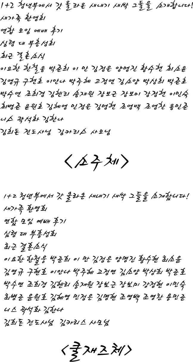 쿨째즈와 소주체부탁드려요~~~!! 정세미 일반 1 4496 2009.07.17 18:29 -0001.11.30 00:00 outline.ai (0byte) + 72 > > 1+2 청년부에서 갓 올라온 새내기 새싹 그들을 소개합니다! > 새가족 환영회 > 연합 모임 예배 후기 > 심령 대 부흥성회 > 최근 결혼소식 > 이요한 한철웅 박준희 이 만 김정은 양명진 황수현 최소윤 > 김영규 구현호 이안나 박주혜 고정연 김소양 박상희 박준호 > 박수연 조희경 김헨리 송재원 장보근 장보미 강정현 이민숙 > 최병준 윤원호 김혜영 민정은 김명현 조영백 조영찬 용민준 > 니스 곽석화 김한나 > 김희돈 전도사님 김카리스 사모님 >